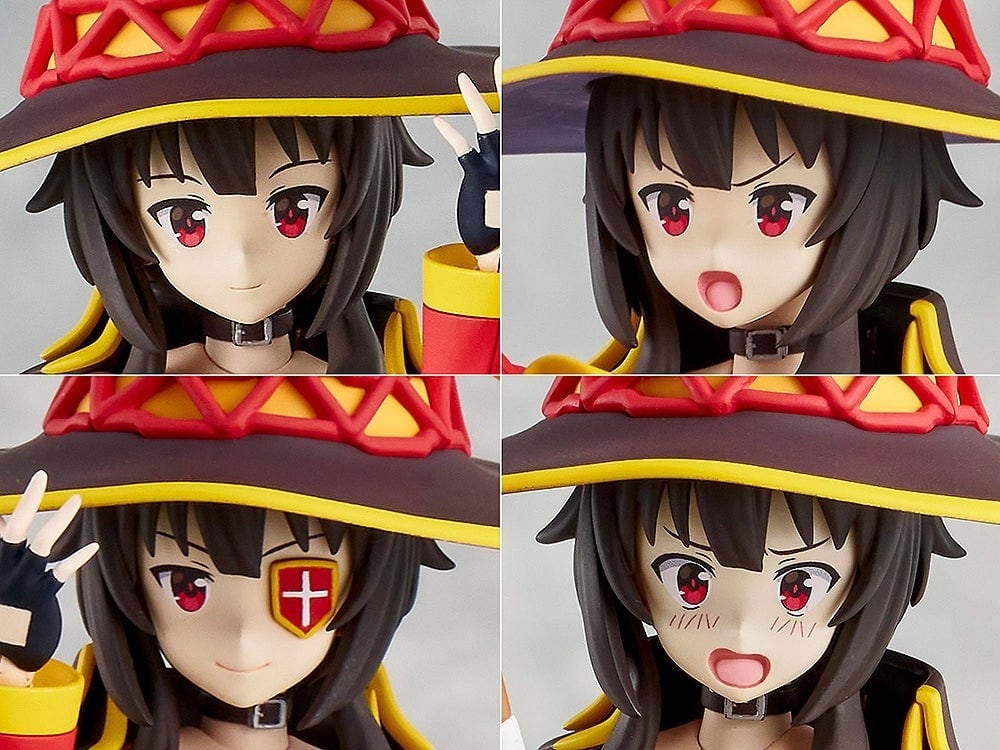 ・オプションパーツとして「帽子」「マント」「手首パーツ3種」 「水着用手首パーツ3種」 「めぐみんの杖」「ちょむすけ」「ディスプレイ用台座」が付属。