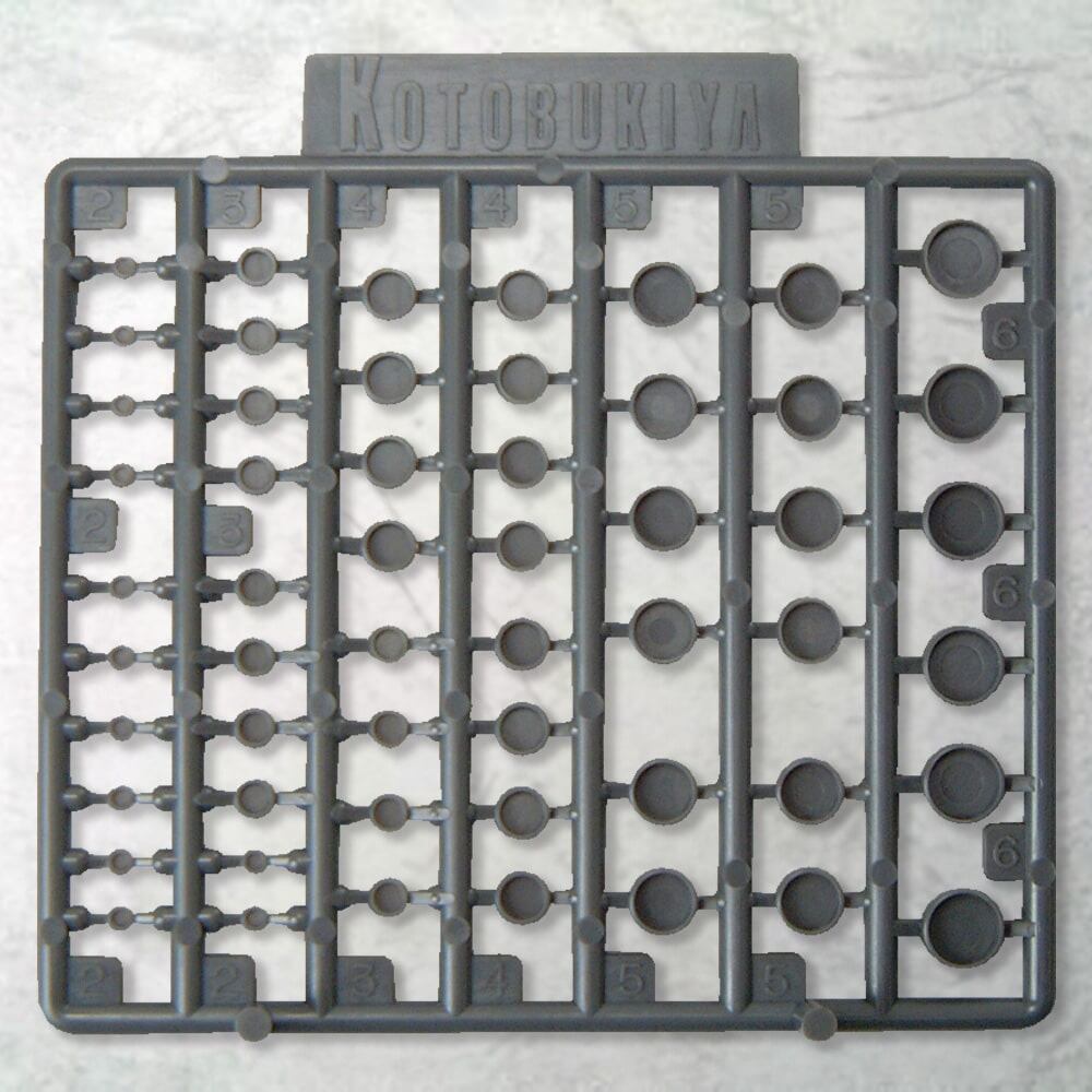 13cm級メカの表面やバックパックなどに最適な、小さな凹面が5サイズ入っております。ランナーにある数値はそれぞれの直径サイズ(mm)を表しております。